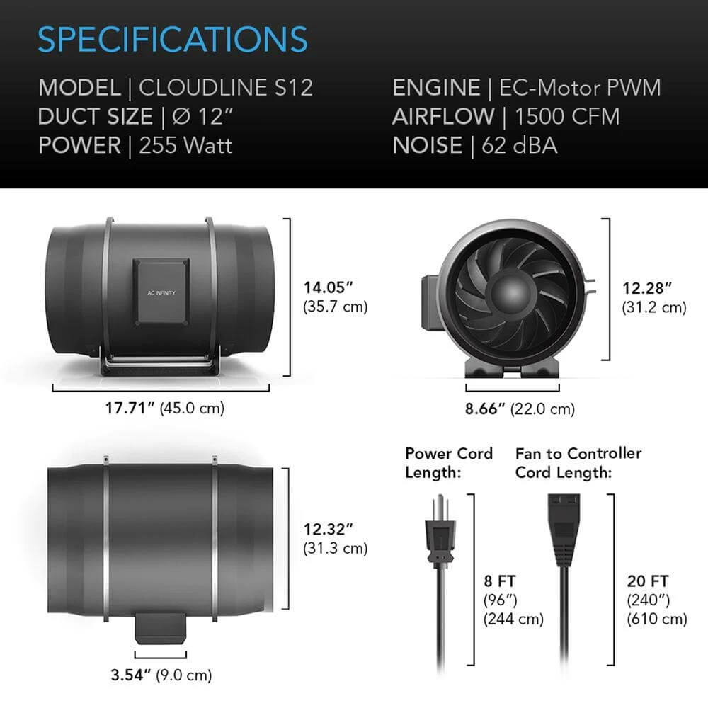 The AC Infinity Cloudline S12, Quiet Inline Duct Fan System With Speed Controller, 12-inch is a smart inline duct fan designed to quietly ventilate hydroponic grow rooms, boost heating/cooling to rooms, circulate fresh air, exhaust projects, and cool AV closets. Features an inline speed controller utilizing PWM-technology. Contains a mixed-flow design and EC-motor for a quiet and high static-pressure performance. The motor box containing the fan’s impeller and blades can be detached from the mounted frame for easy cleaning and maintenance. Complete kit includes one duct fan unit, one corded speed controller, installation manual, all necessary mounting hardware, and a corded AC plug to power the unit through a standard outlet.