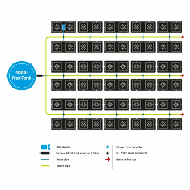 The easy2grow System is easily extended so many pots can be linked to a single reservoir. Please see examples of typical layouts using 3/8โณ pipe or 1/2โณ pipe in the image gallery. The pots & trays can be easily moved at will, if the plants grow too large they can be spaced further apart with ease. Once set up and a reservoir is filled with water & mineral liquid feed this extremely versatile system will completely take care of all your plantโs needs.