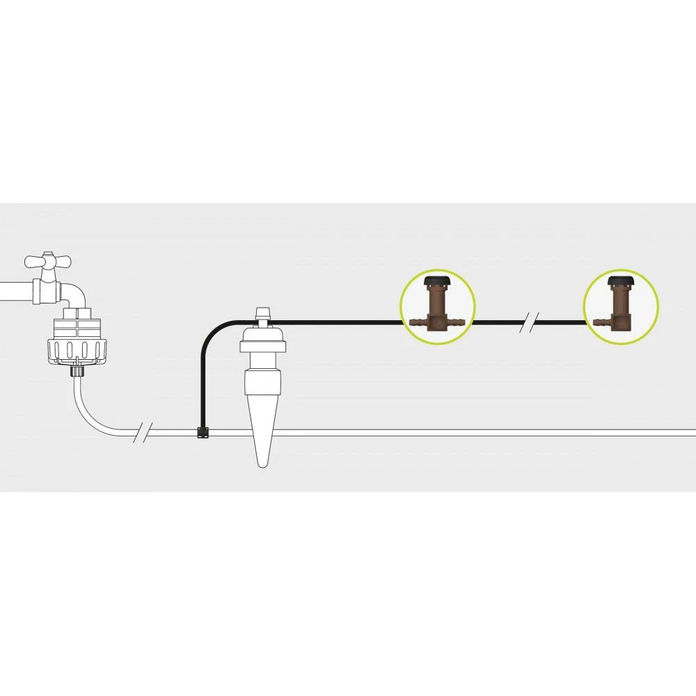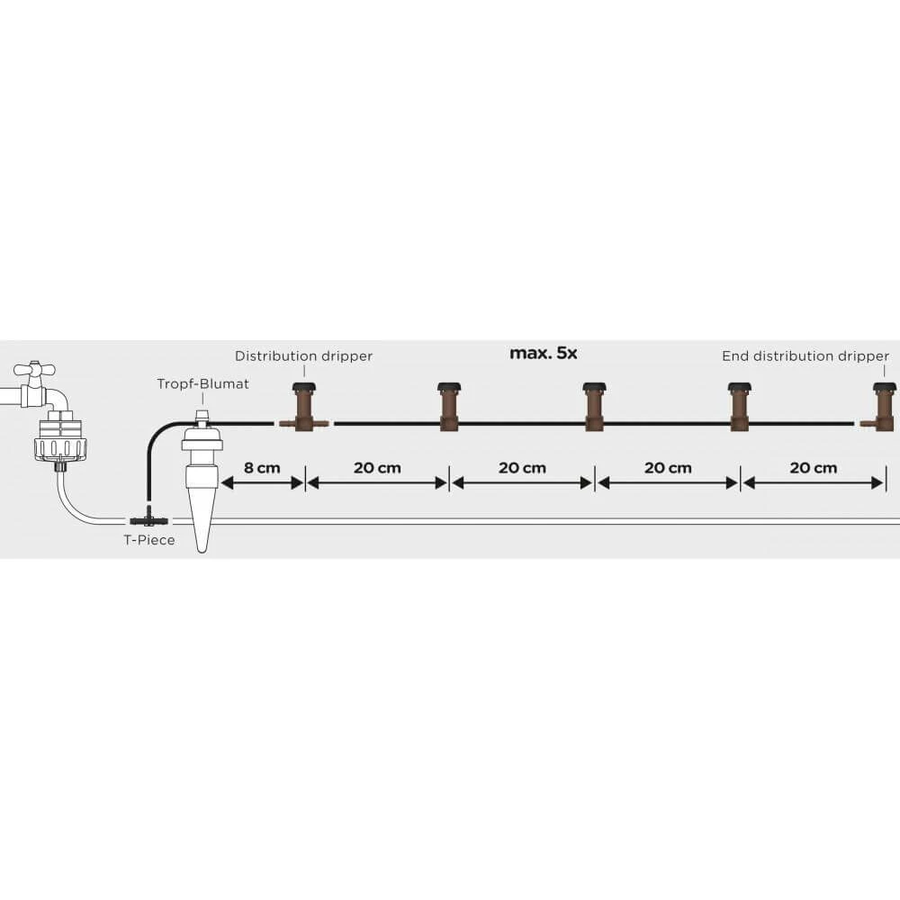 If your plants and conditions are the same, you can also put one Tropf Blumat in the first pot with one distribution dripper and one or two in each plant after that. One customer reported doing this successfully with 25 distribution drippers running off just one Blumat sensor.