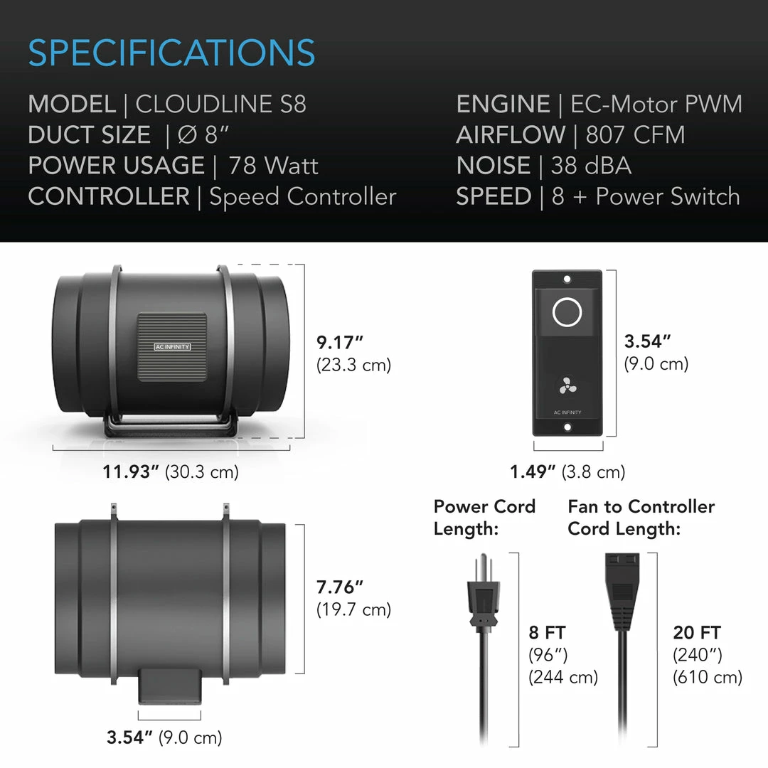 - 1 x Cloudline S8 Inline Duct Fan w/ Adjustable Speed Controller | 8-Inch