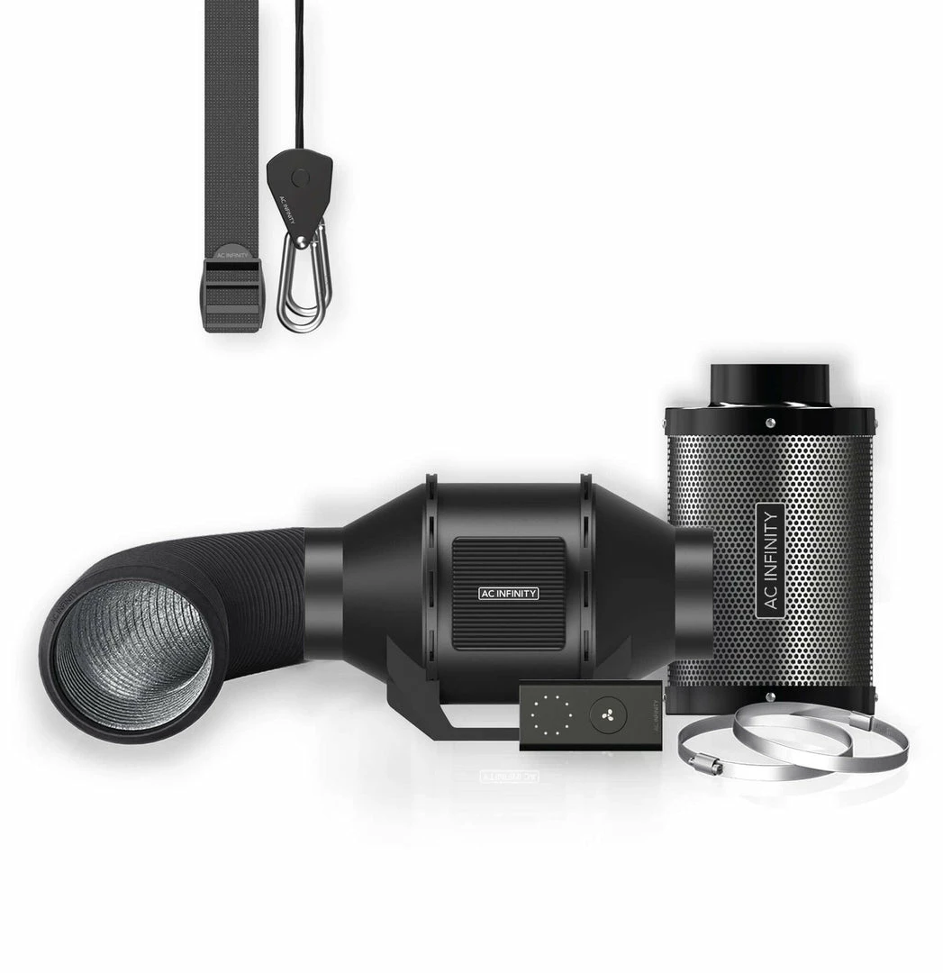 The centerpiece of this kit is theย Gorilla 3โ x 3โ grow tent. Premium canvas andย the sturdiest steel frame around make this tent, truly, top notch. The Gorilla tent is paired with the AC Infinity S4 Inline Duct Fan and 8 feet of ducting. As discretion is of utmost importance, a 4-inch Australian Charcoal Duct Carbon Filter connects with the fan to eliminate all odors.ย