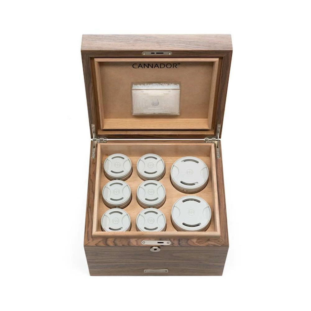The 8-Strain (with drawer) Cannador® is a much larger model with ample space to put your accoutrement and store everything in one location. It has six small 1/4oz jars and two large 1/2oz jars so you can fit 2.5 ounces total. In short, this is a mini-chest! The interior is lined with mahogany and the exterior comes in either walnut veneer. The finish is clear matte to give the wood a more natural look.