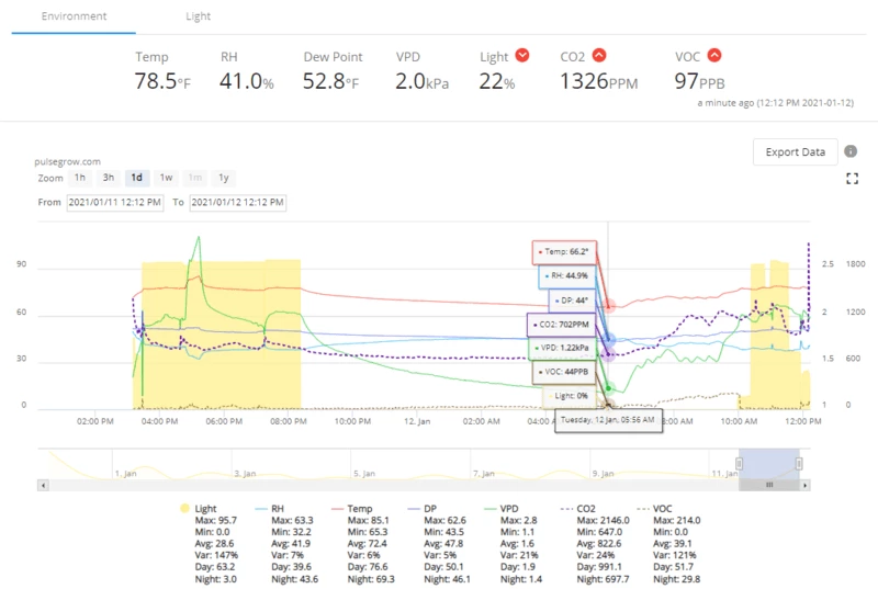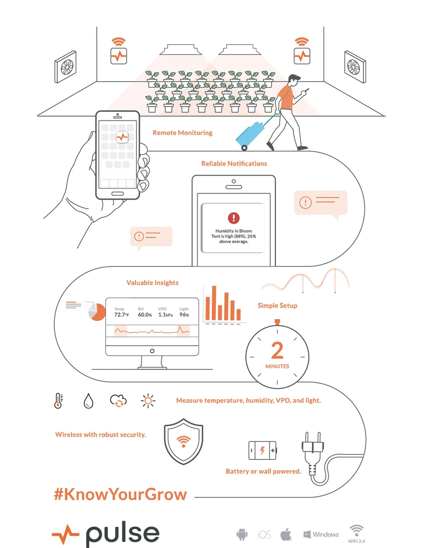 Humidityย – One of the most overlooked aspects of indoor gardening is humidity. Humidity levels can determine if your plants are thriving. However, the wrong humidity can put them at risk of developing mold or pest issues. If your humidity gets too low than you may find your media losing moisture very quickly, which can leave you with plants that dry out sooner than you are available to tend to them. Alternatively if your humidity gets too high you can develop mold issues, especially during flowering stage. Having your entire crop developing mold just before harvest due to a humidity issue can be the most disappointing experience a grower can go through. Pulse puts you in a position to know and react to this!